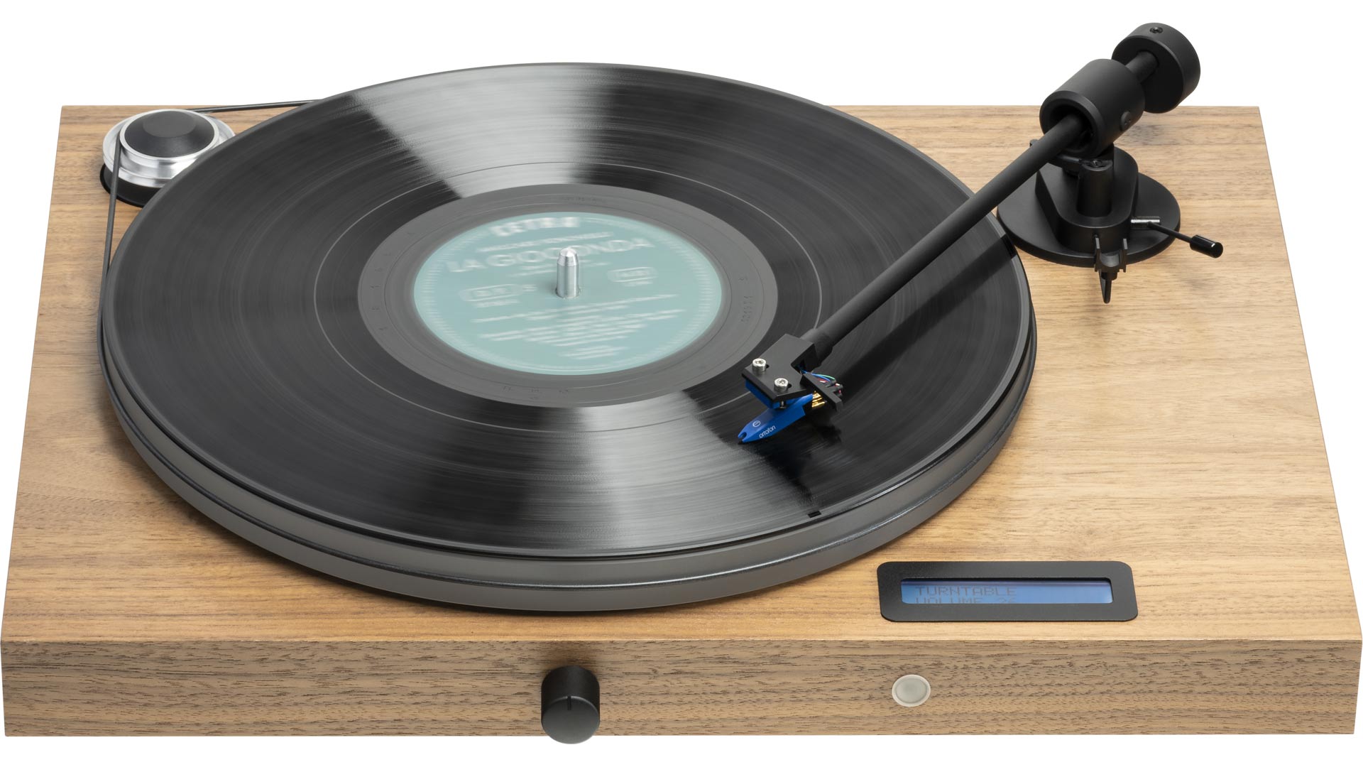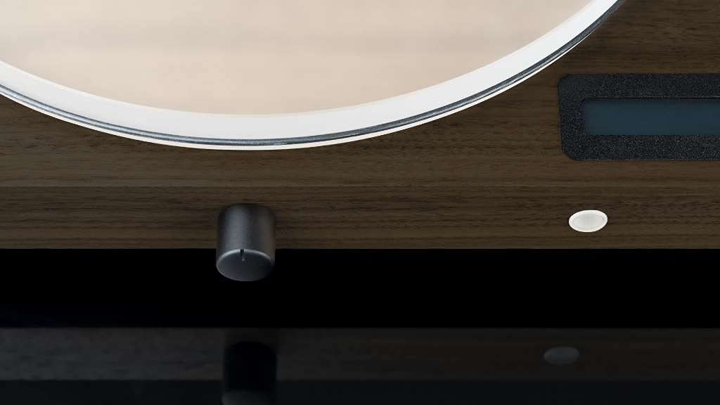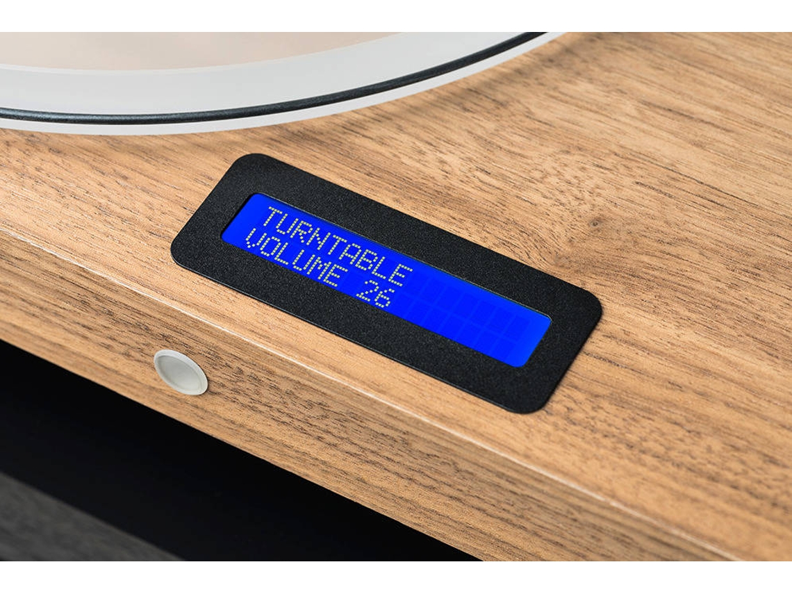 • Painel digital azul num mostrador de madeira clara com texto 'TURNTABLE VOLUME 23'