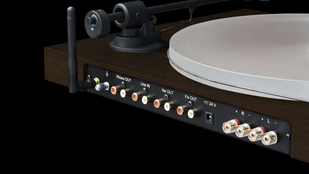 • Parte traseira de gira-discos com várias conexões e acabamento em madeira clara