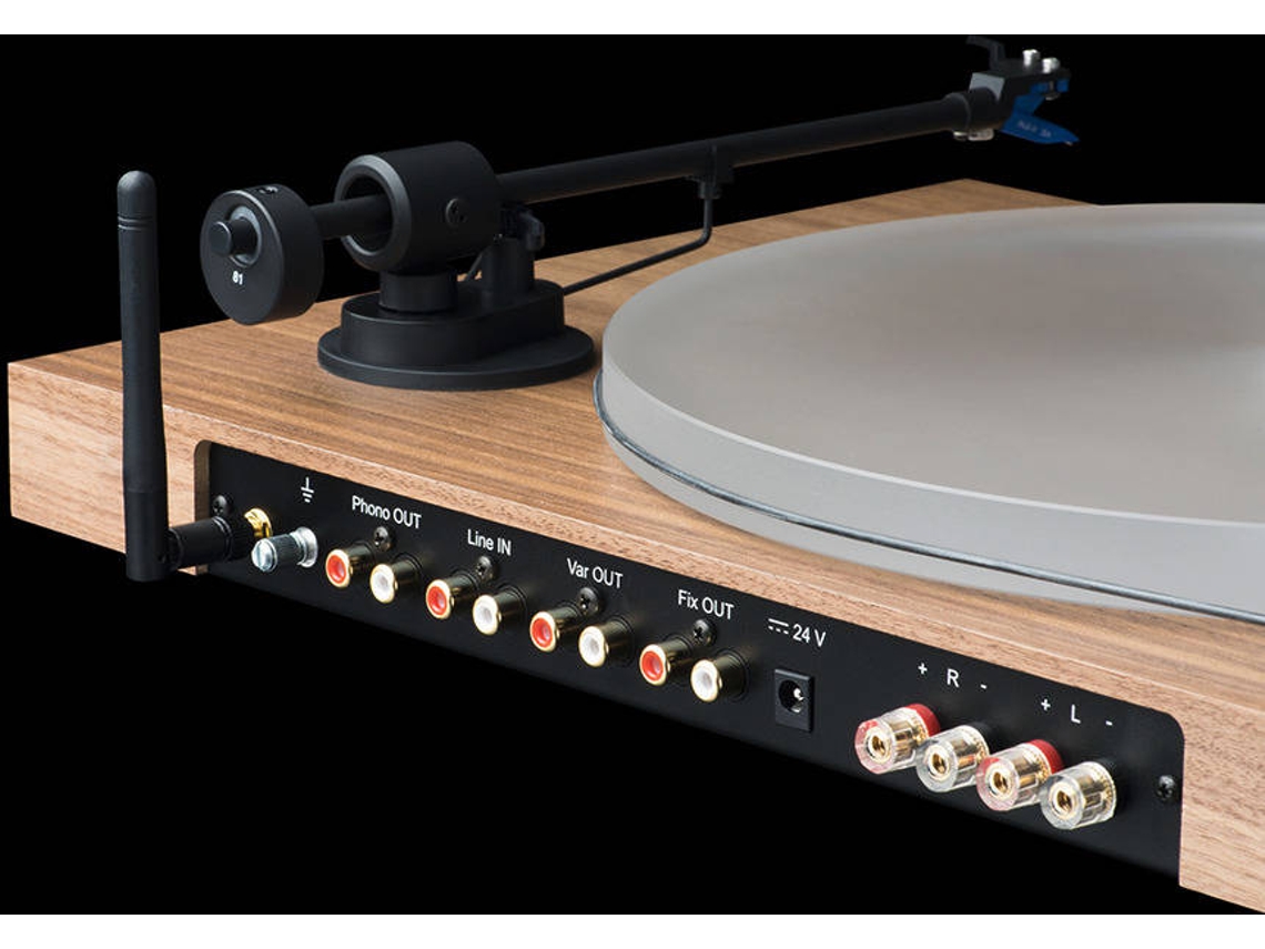 • Braço e painel lateral de gira-discos com múltiplas conexões e base em madeira escura