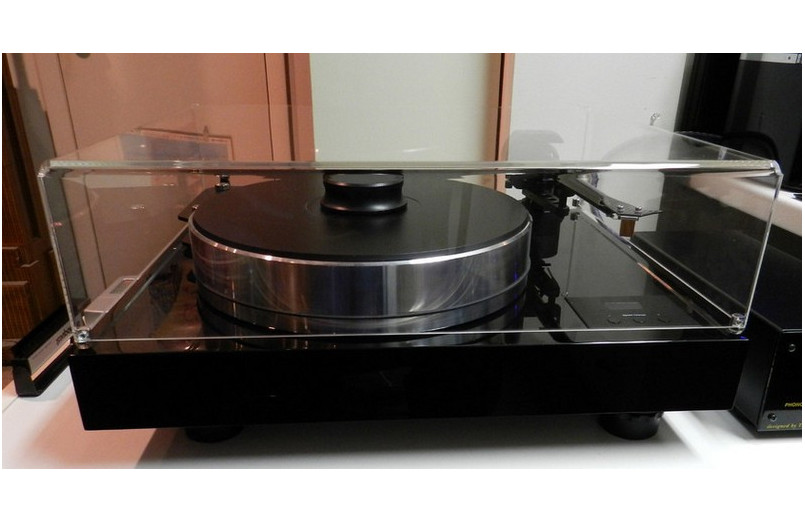 • Gira-discos com base de madeira escura e tampa transparente levantada